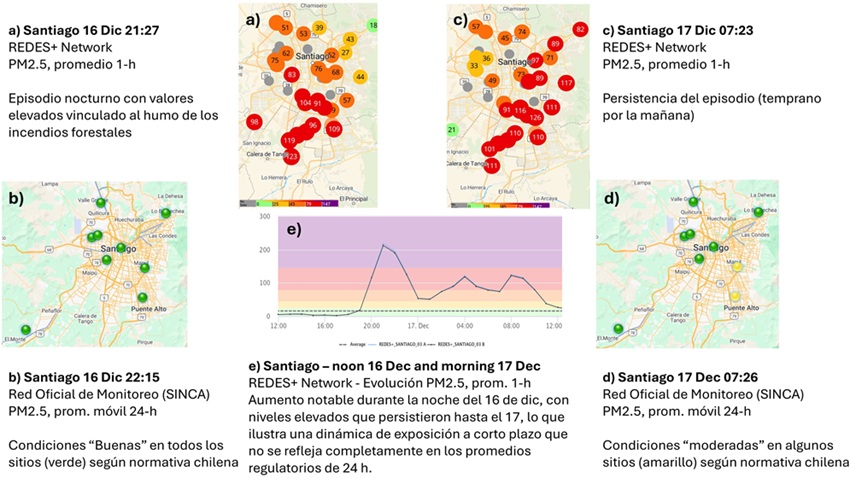 (Episodio de PM2.5 asociado a humo de incendios en Santiago el 16 y 17 de diciembre, observado por la red REDES+ con resolución horaria (paneles de arriba) y por la red oficial SINCA mediante promedios móviles de 24 horas (paneles de abajo). La comparación muestra diferencias espaciales marcadas y resalta episodios de corta duración que no se reflejan plenamente en métricas reguladas)
