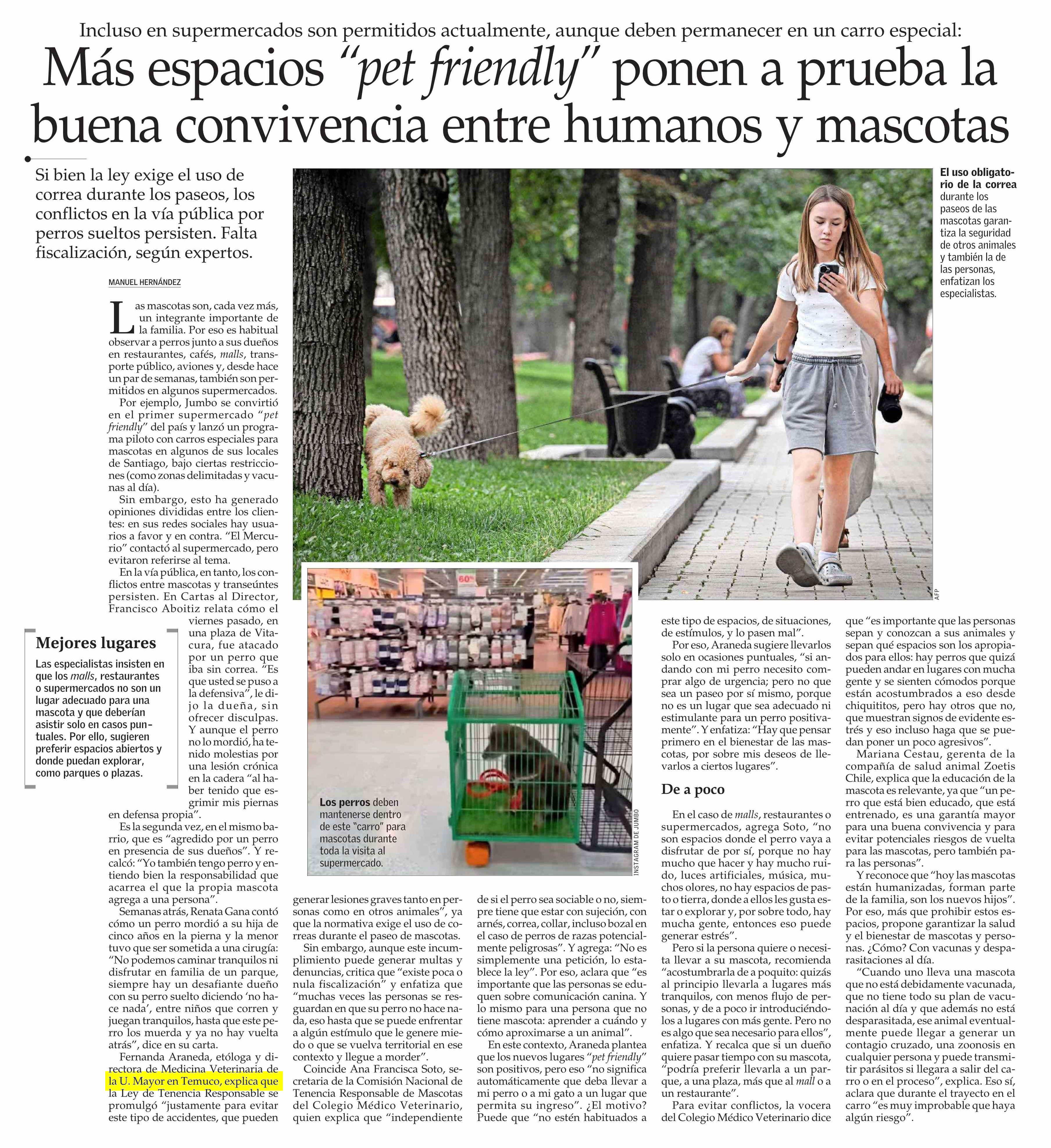 Ante el caso de un perro que mordió a una niña en un parque, Fernanda Araneda, etóloga y directora de Medicina Veterinaria de la U. Mayor en Temuco, explica que la Ley de Tenencia Responsable se promulgó "justamente para evitar este tipo de accidentes, que pueden generar lesiones graves tanto en personas como en otros animales", ya que la normativa exige el uso de correas durante el paseo de mascotas. Revísalo aquí.