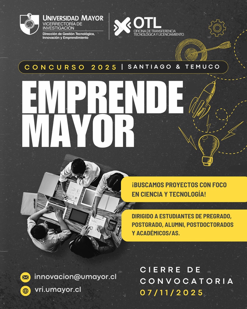 La Dirección de Gestión Tecnológica, Innovación y Emprendimiento (DGTIE) abrió la convocatoria del Concurso Emprende Mayor 2025, para las sedes de Santiago y Temuco de la Universidad Mayor.