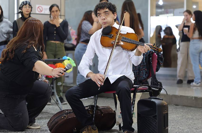 El miércoles estuvo dedicado a actividades vinculadas al arte y la cultura, con experiencias que permitieron a los estudiantes aproximarse a la inclusión desde una vivencia sensorial y expresiva. Uno de los invitados fue el músico multiinstrumentista Renato Villagra, artista no vidente, quien ofreció una interpretación musical con violín y compartió su historia con los estudiantes.