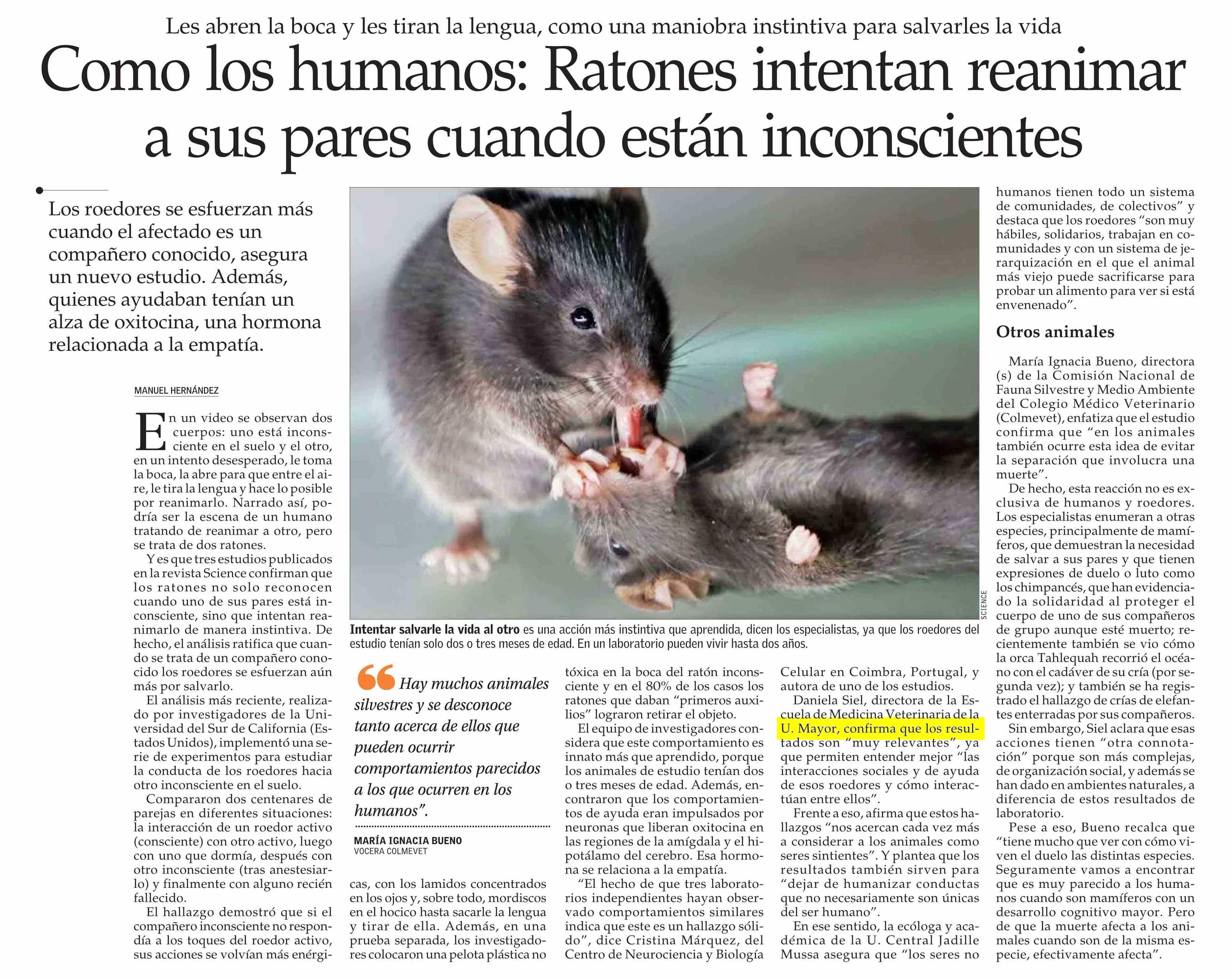 Daniela Siel, directora de Medicina Veterinaria U. Mayor, confirma que los resultados permiten entender mejor "las interacciones sociales y de ayuda de esos roedores, y cómo interactúan". Frente a eso, plantea que el hallazgo "nos acerca cada vez más a considerar a los animales como seres sintientes", y que también sirve para "dejar de humanizar conductas que no son únicas del ser humano". Leer nota aquí.
