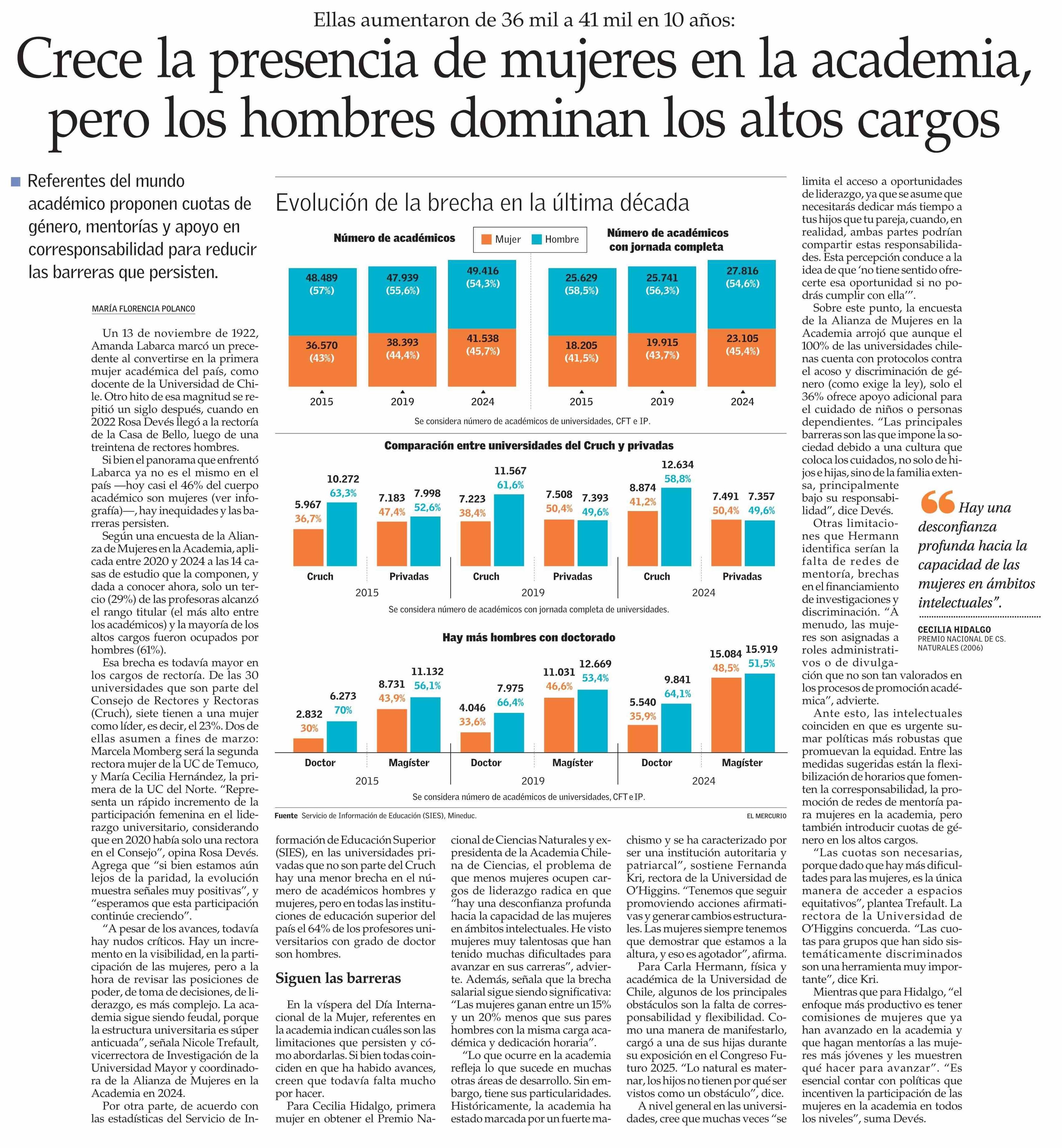 Según una encuesta de la Alianza de Mujeres en la Academia, solo un tercio (29%) de las profesoras alcanzó el rango de titular y la mayoría de los altos cargos fueron ocupados por hombres (61%). “A pesar de los avances, todavía hay nudos críticos (...) a la hora de revisar las posiciones de poder es más complejo”, dice Nicole Trefault, vicerrectora de Investigación U. Mayor y coordinadora de la Alianza en 2024. Leer nota aquí.