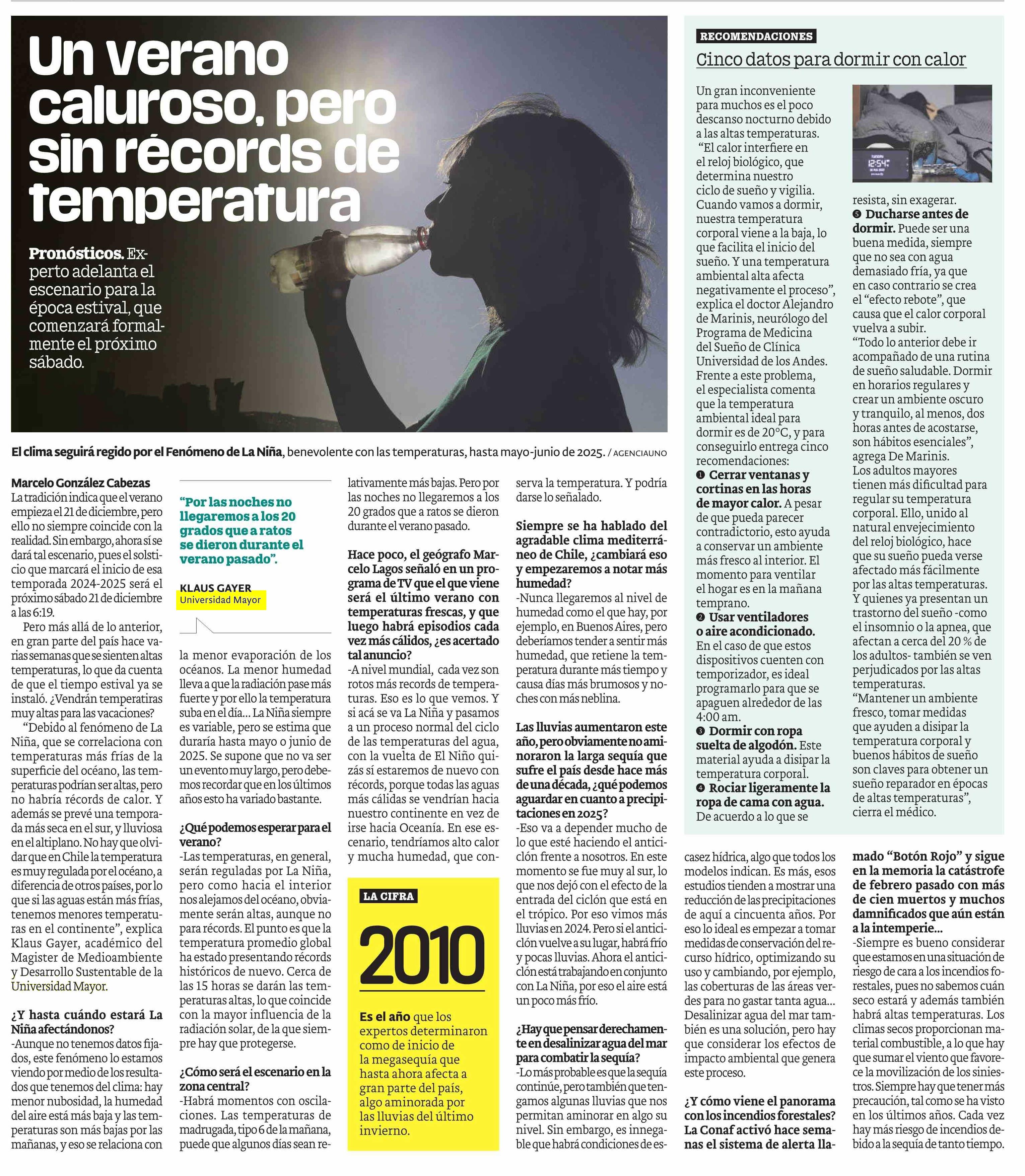 “(A raíz del fenómeno de La Niña) Se prevé una temporada más seca en el sur, y lluviosa en el altiplano. No hay que olvidar que en Chile la temperatura es muy regulada por el océano, a diferencia de otros países, por lo que si las aguas están más frías, tenemos menores temperaturas en el continente”, explica Klaus Gayer, académico de Ingeniería en Medio Ambiente y Sustentabilidad U. Mayor. Leer nota aquí.