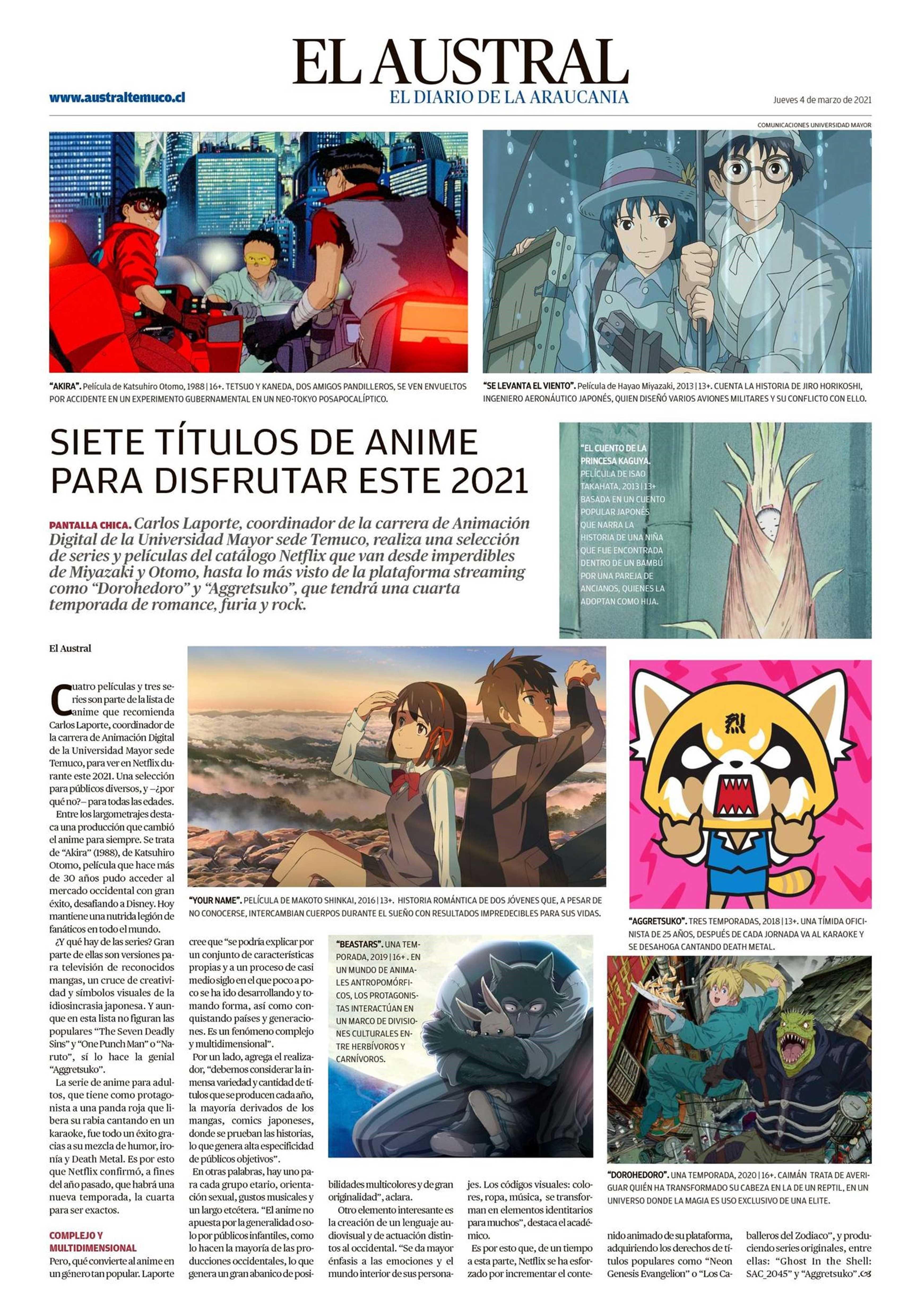 Carlos Laporte, coordinador de la carrera de Animación Digital de la Universidad Mayor sede Temuco, realiza una selección de series y películas del catálogo Netflix que van desde imperdibles de Miyazaki y Otomo, hasta lo más visto de la plataforma streaming como “Dorohedoro” y “Aggretsuko”, que tendrá una cuarta temporada de romance, furia y rock. Continúa leyendo aquí.