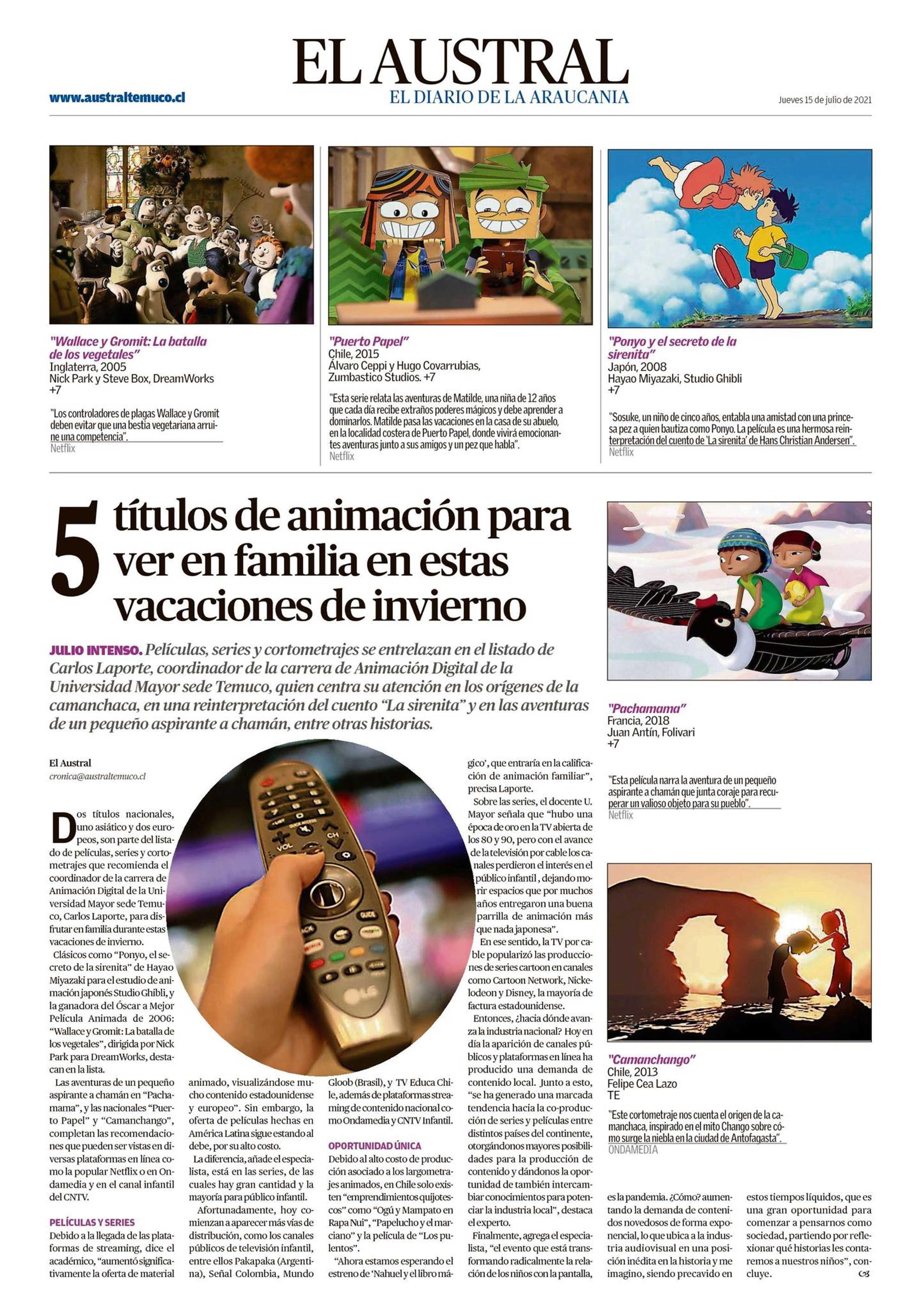 Películas, series y cortometrajes se entrelazan en el listado de Carlos Laporte, coordinador de la carrera de Animación Digital de la Universidad Mayor sede Temuco, quien centra su atención en los orígenes de la camanchaca, en una reinterpretación del cuento “La sirenita” y en las aventuras de un pequeño aspirante a chamán, entre otras historias. Sigue leyendo aquí.
