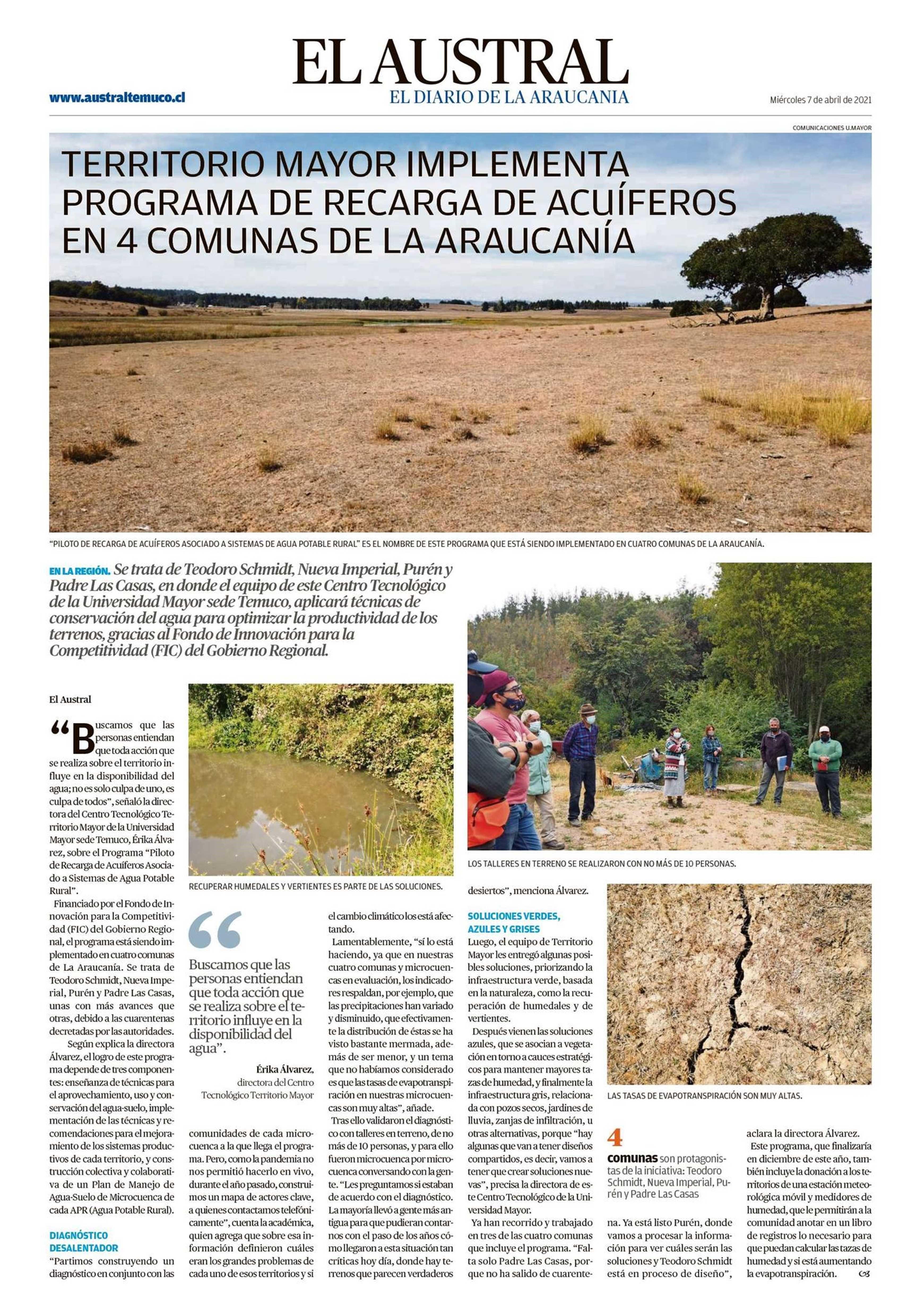Se trata de Teodoro Schmidt, Nueva Imperial, Purén y Padre Las Casas, en donde el equipo del Centro Tecnológico Territorio Mayor de la Universidad Mayor sede Temuco, aplicará técnicas de conservación del agua para optimizar la productividad de los terrenos, gracias al Fondo de Innovación para la Competitividad (FIC) del Gobierno Regional. Sigue leyendo aquí.