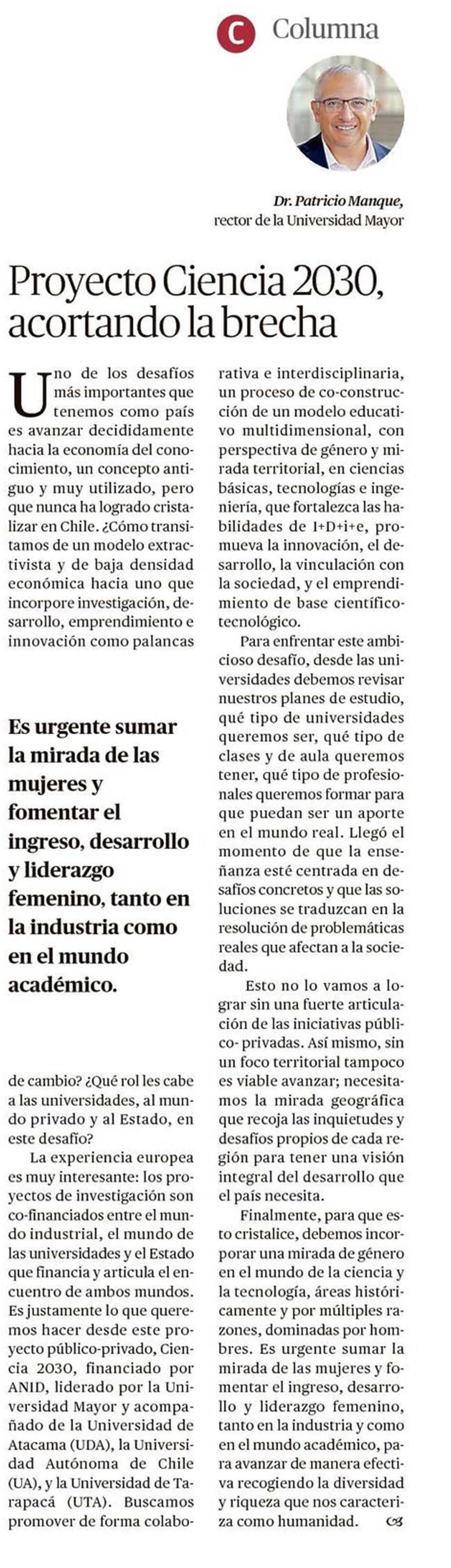 La experiencia europea es muy interesante: los proyectos de investigación son co-financiados entre el mundo industrial, el mundo de las universidades y el Estado que financia y articula el encuentro de ambos mundos. Es justamente lo que queremos hacer desde este proyecto público-privado, Ciencia 2030, financiado por ANID, liderado por la Universidad Mayor y acompañado de la Universidad de Atacama (UDA), la Universidad Autónoma de Chile (UA), y la Universidad de Tarapacá (UTA). Buscamos promover de forma colaborativa e interdisciplinaria, un proceso de co-construcción de un modelo educativo multidimensional, con perspectiva de género y mirada territorial, en ciencias básicas, tecnologías e ingeniería, que fortalezca las habilidades de I+D+i+e, promueva la innovación, el desarrollo, la vinculación con la sociedad, y el emprendimiento de base científico-tecnológico.