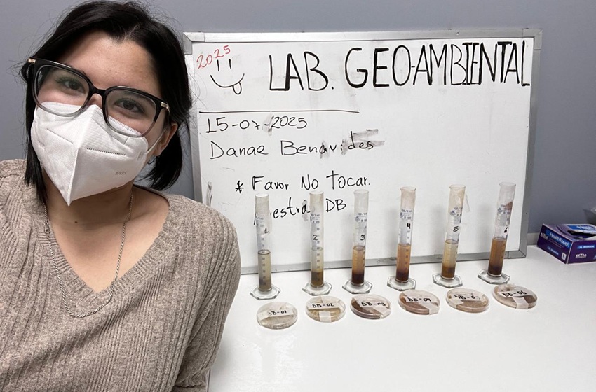 El proyecto también consideró la participación de estudiantes de pregrado de nuestra casa de estudios. En este contexto, Danae Benavides, estudiante de la Escuela de Geología, desarrolló su práctica profesional durante 2025, enfocando su investigación en la caracterización físico-química de suelos arcillosos en sectores afectados. El estudio contempló el análisis de parámetros como pH, conductividad eléctrica y procesos de decantación, además de aspectos teóricos asociados a la meteorización y al basamento geológico del sector.