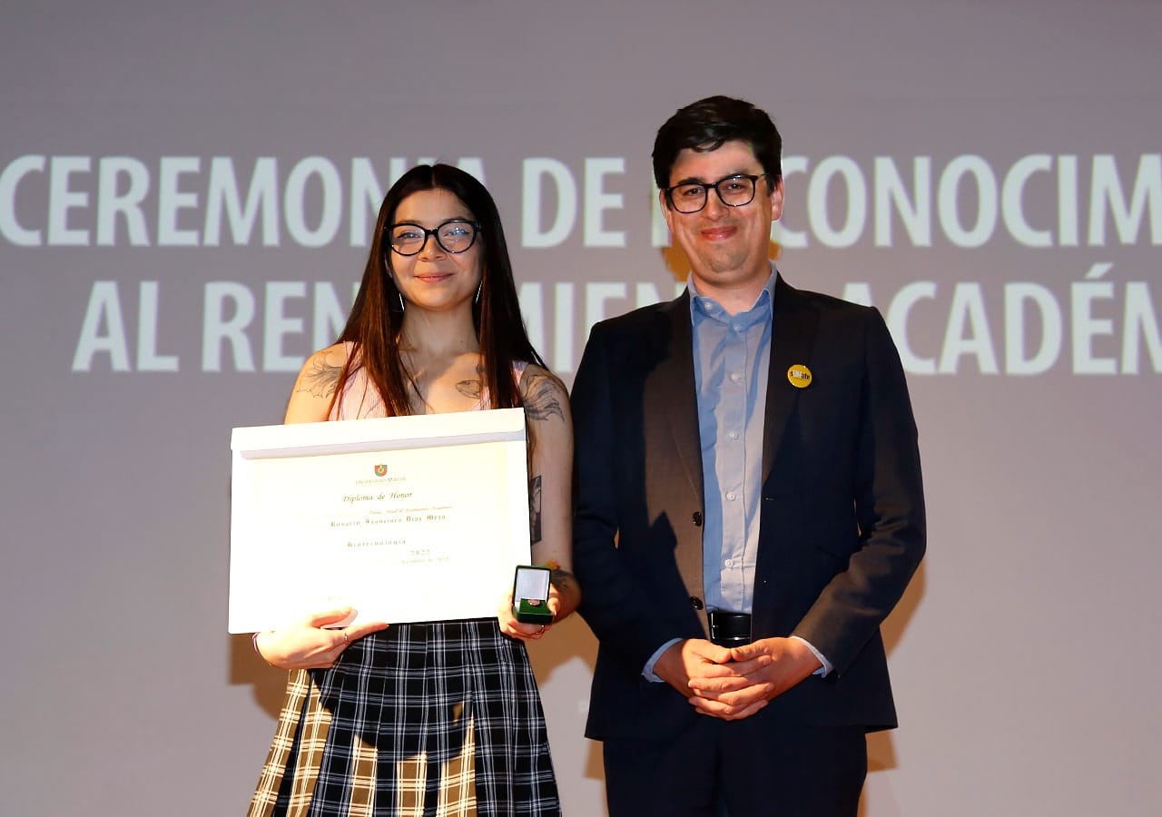 Los jóvenes recibieron un reconocimiento de la Universidad durante una ceremonia realizada en el auditorio del campus Manuel Montt, que incluyó la asistencia de decenas de familiares. "Estos reconocimientos dan un poco más de energía para seguir adelante", comentó María Jesús Abrigo, destacada de Medicina.