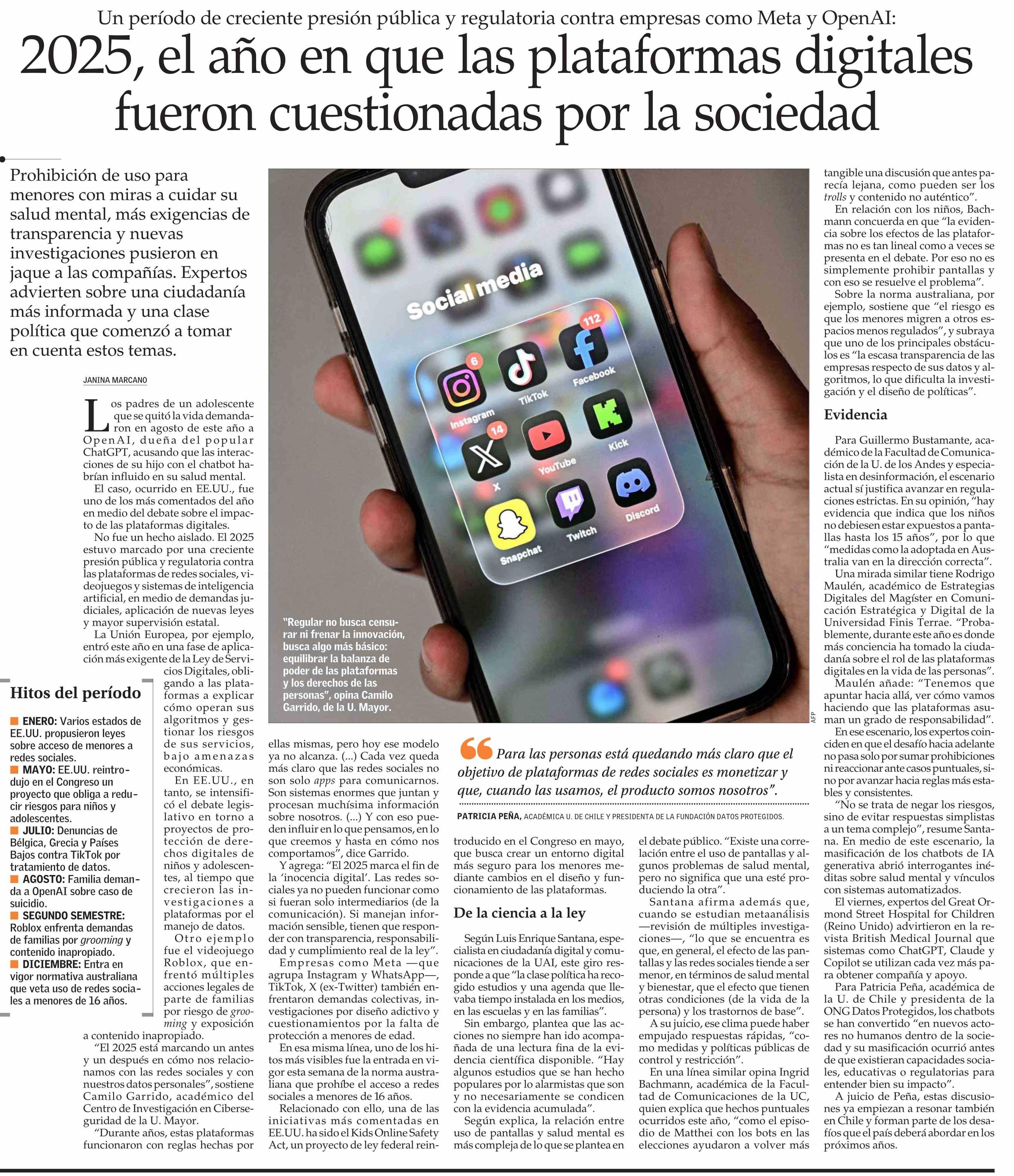 “Cada vez queda más claro que las redes sociales no son solo apps para comunicarnos. Son sistemas enormes que juntan y procesan muchísima información sobre nosotros. (... ) Y con eso pueden influir en lo que pensamos y creemos, hasta en cómo nos comportamos”, dice Camilo Garrido, académico del Centro de Investigación en Ciberseguridad UM, quien agrega: "El 2025 marca el fin de la inocencia digital". Revísalo aquí.