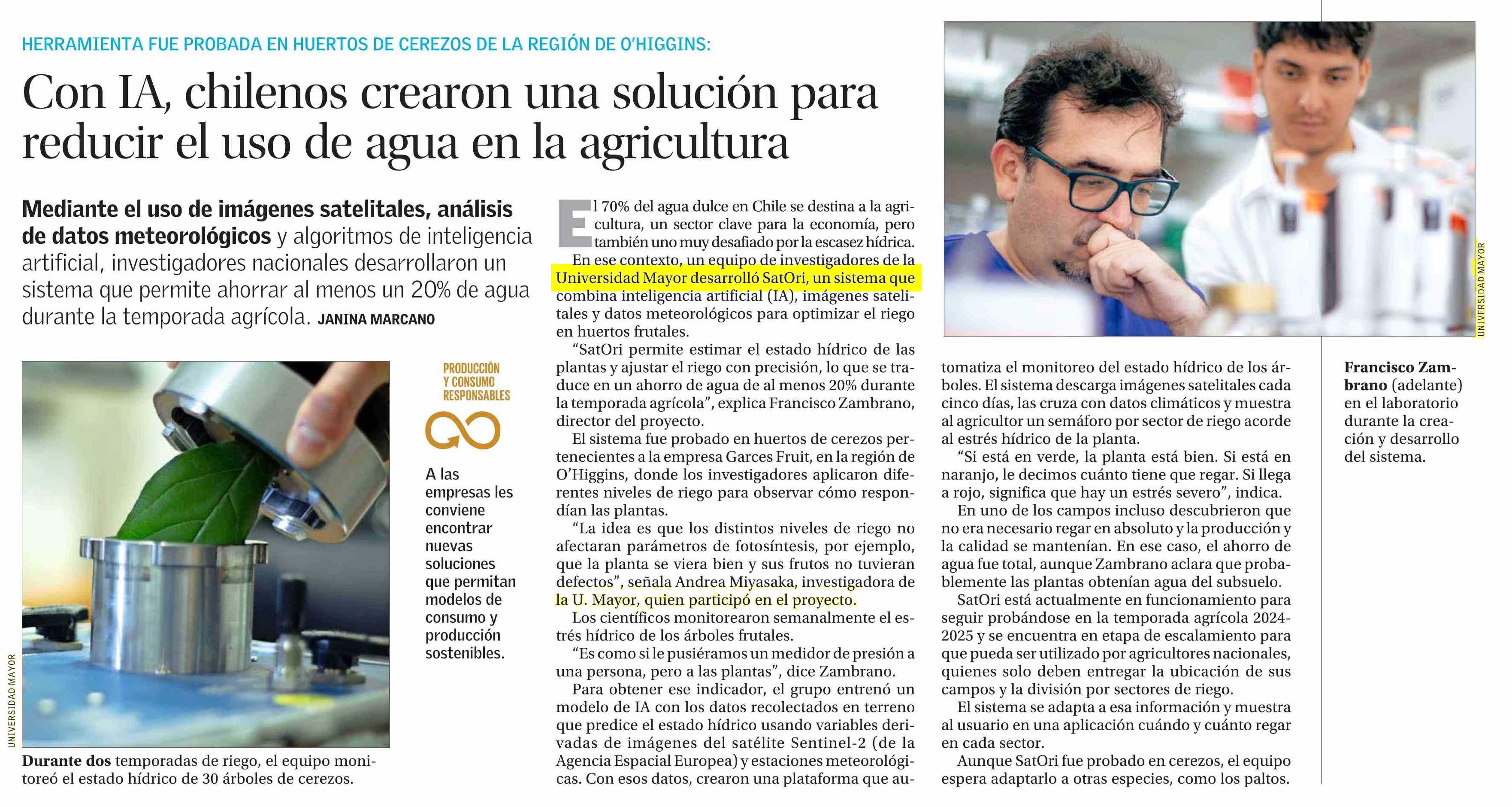 SatOri es un sistema que combina inteligencia artificial, imágenes satelitales y datos meteorológicos para optimizar el riego en huertos frutales. “Permite estimar el estado hídrico de las plantas y ajustar el riego con precisión, lo que se traduce en un ahorro de agua de al menos 20% durante la temporada agrícola”, explica Francisco Zambrano, director del proyecto e investigador del Centro Hémera. Leer nota aquí.