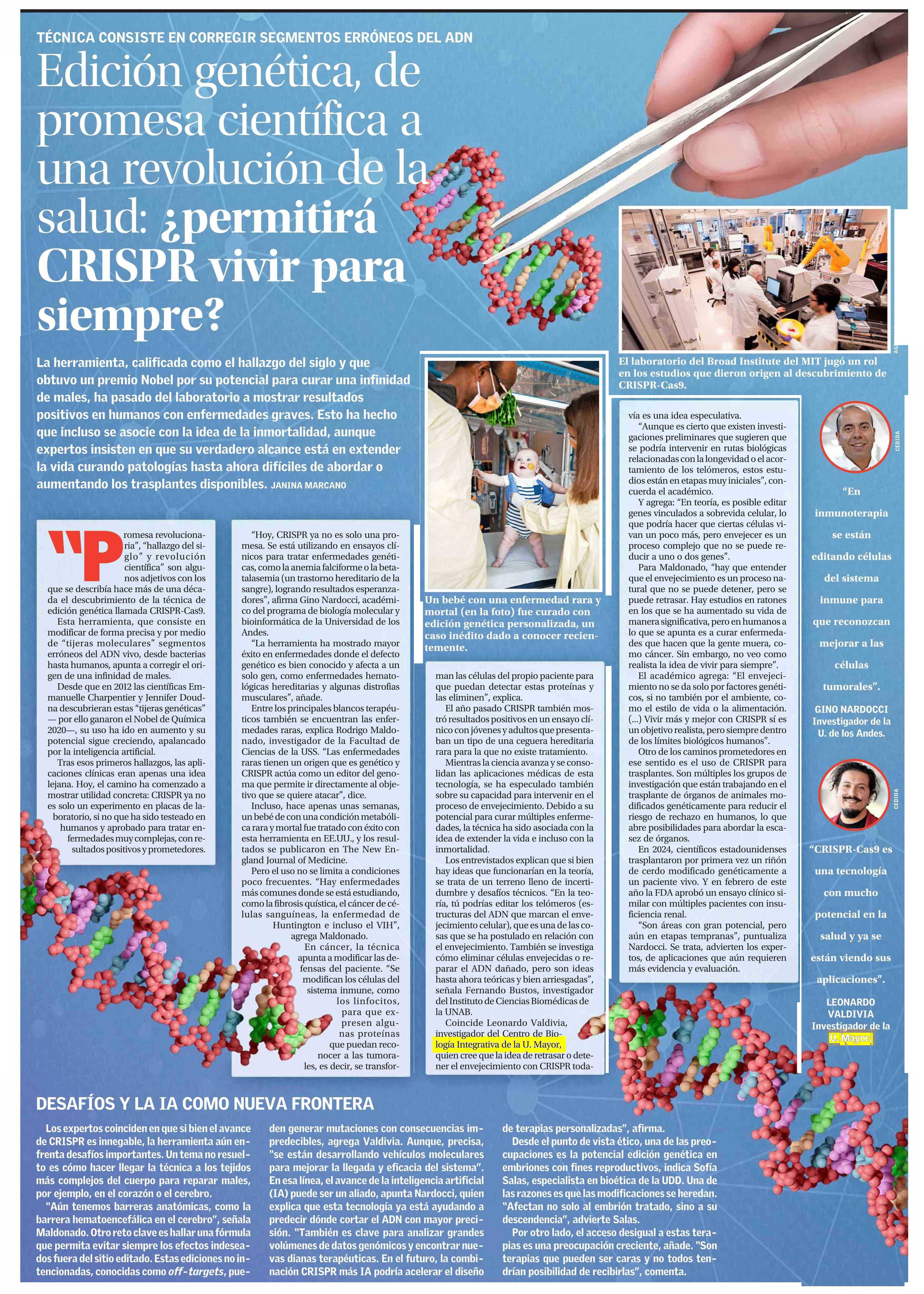 Leonardo Valdivia, investigador del Centro CIB U. Mayor, cree que la idea de retrasar o detener el envejecimiento con la técnica CRISPR, todavía es una idea especulativa. “En teoría, es posible editar genes vinculados a sobrevida celular, lo que podría hacer que ciertas células vivan un poco más, pero envejecer es un proceso complejo que no se puede reducir a uno o dos genes”, explica. Leer nota aquí.