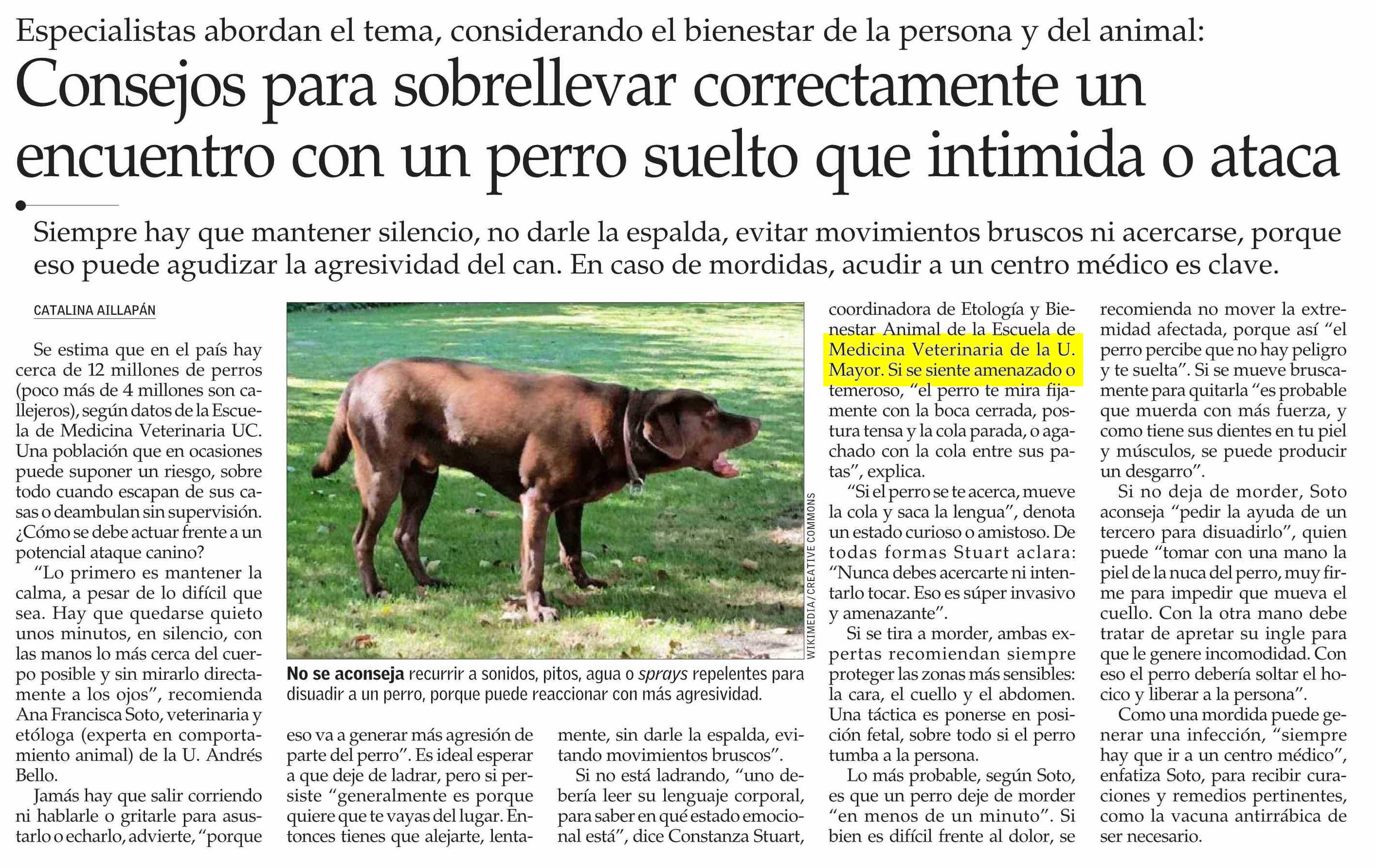 Constanza Stuart, coordinadora de Etología y Bienestar Animal de Medicina Veterinaria U. Mayor, detalla que si el perro se siente amenazado o temeroso “te mirará fijamente con la boca cerrada, postura tensa y la cola parada, pero si se te acerca, mueve la cola y saca la lengua, denota un estado curioso o amistoso". De todas formas, la académica aclara: “Nunca debes acercarte ni intentarlo tocar". Revísalo aquí.