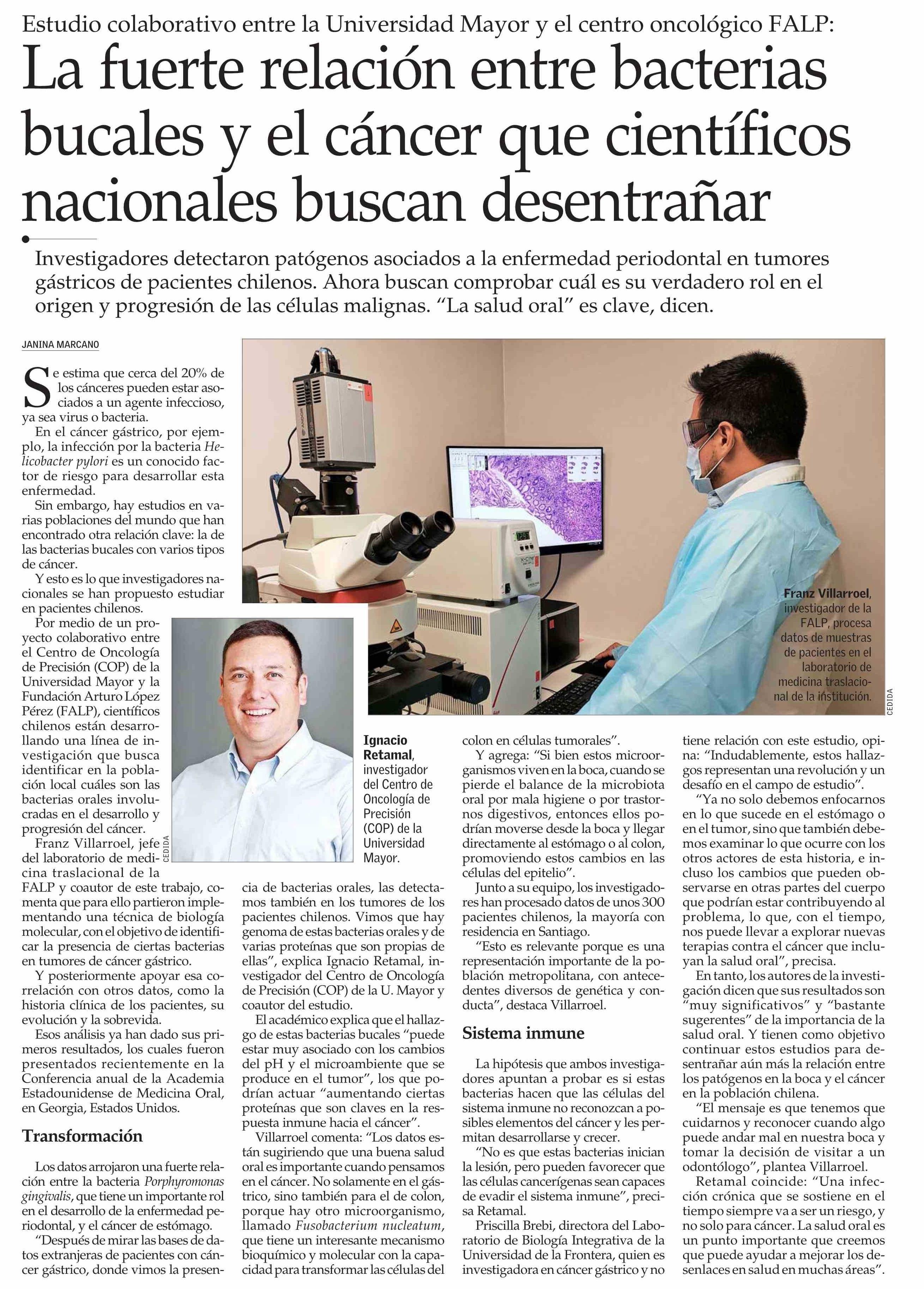 Por medio de un proyecto colaborativo entre el Centro de Oncología de Precisión y la Fundación Arturo López Pérez, científicos chilenos están desarrollando una línea de investigación que busca identificar en la población local cuáles son las bacterias orales involucradas en el desarrollo y progresión de esta patología. Leer nota aquí