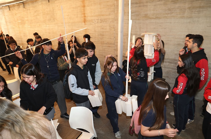 La idea es que los escolares experimenten, de manera práctica, lo que implica ser parte de la carrera. Así, poniendo a prueba sus conocimientos de física y matemática avanzada, los participantes debieron construir la torre más alta y liviana posible utilizando solo hojas de roneo y clips, en el menor tiempo posible.