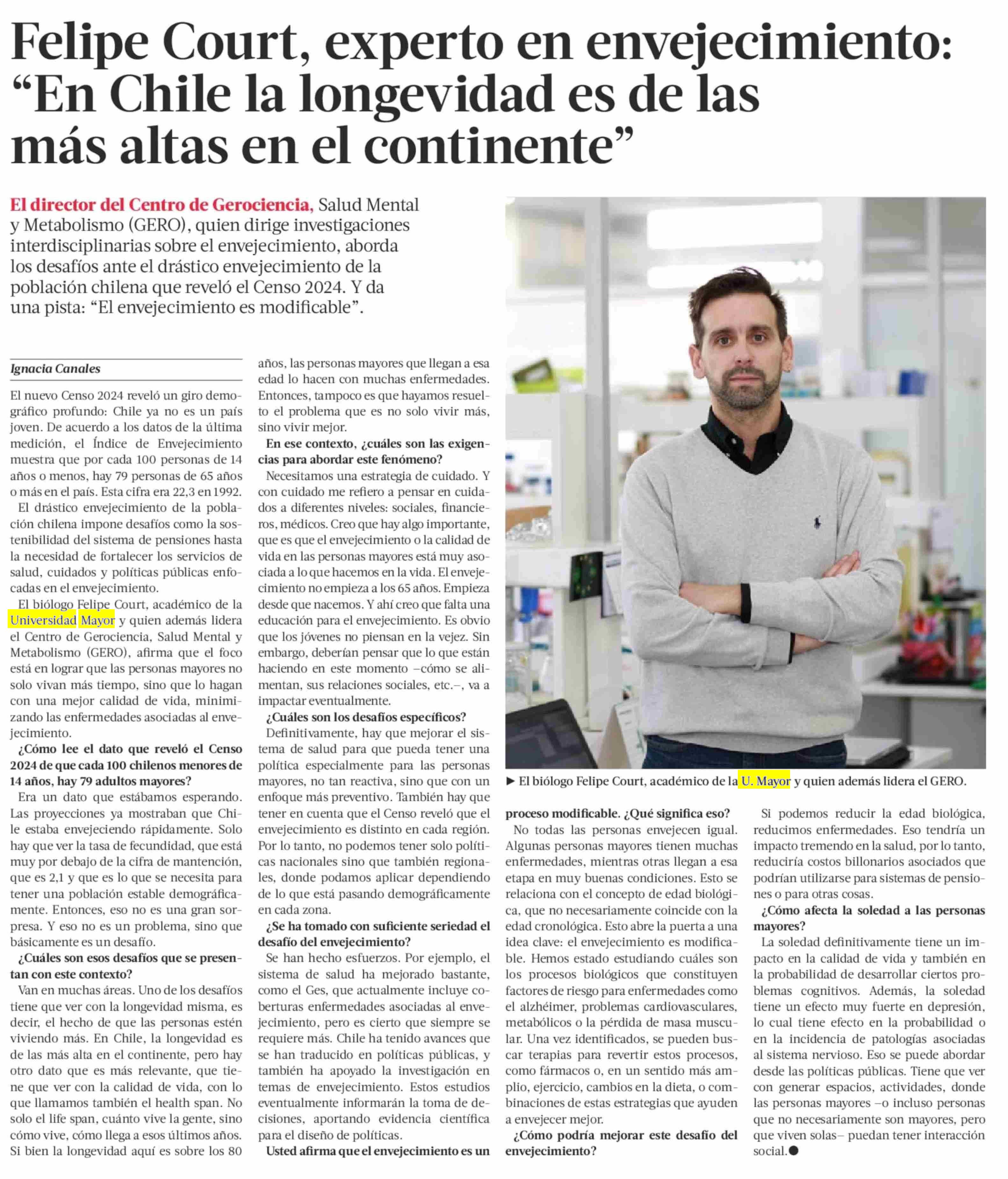 El académico U. Mayor, quien además lidera el Centro de Gerociencia, Salud Mental y Metabolismo (GERO), analizó las últimas cifras del Censo y comentó que el foco de las políticas públicas debe estar puesto en lograr que las personas mayores no solo vivan más tiempo, sino que lo hagan con una mejor calidad de vida, minimizando las enfermedades asociadas al envejecimiento. Leer nota aquí.