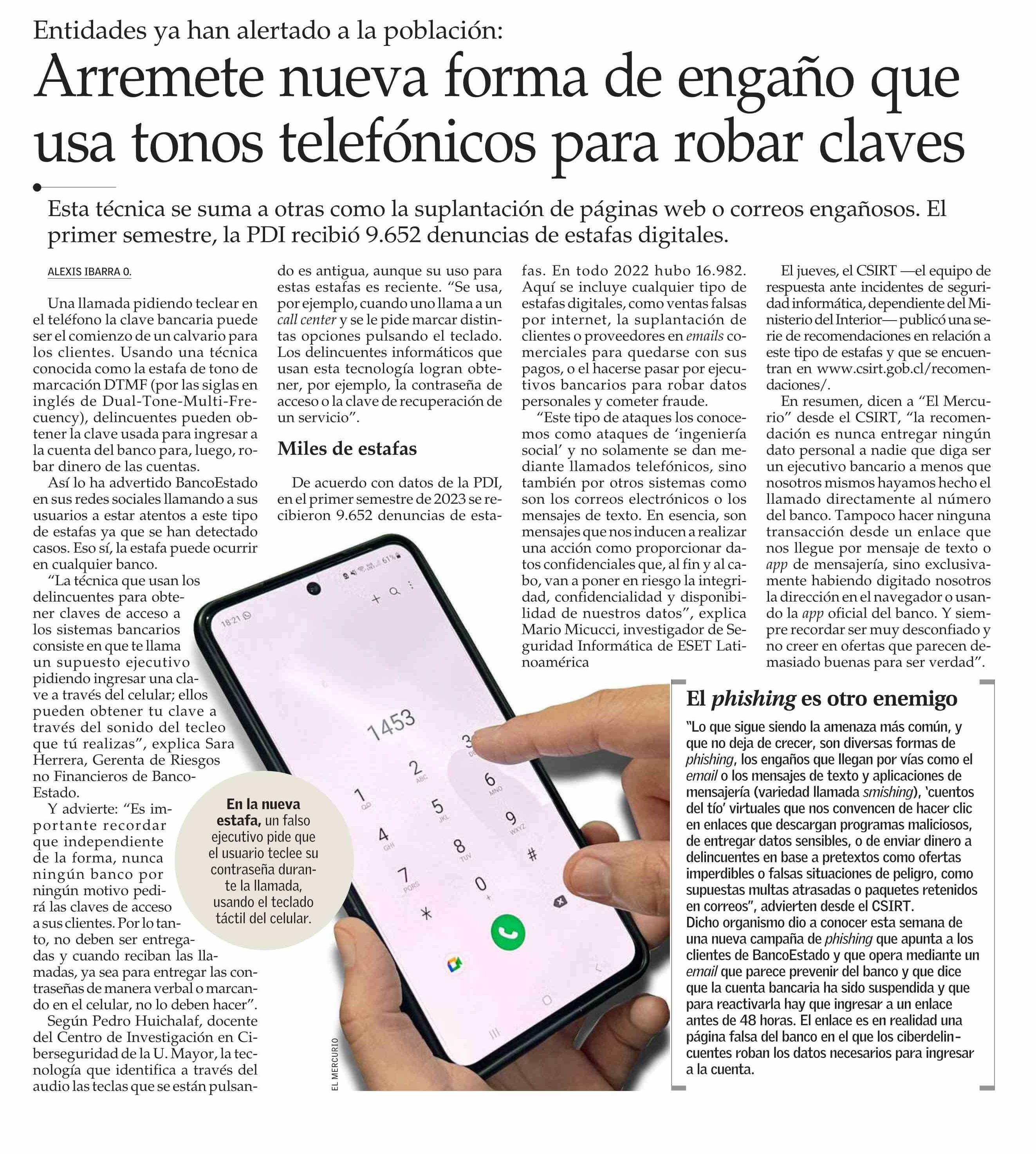 Pedro Huichalaf, docente del Centro de Investigación en Ciberseguridad U. Mayor, dice que la tecnología que identifica a través del audio las teclas que se están pulsando es antigua, aunque su uso para estafas es reciente. "Se usa, por ejemplo, cuando uno llama a un call center y se le pide marcar distintas opciones pulsando el teclado", advierte. Leer nota aquí