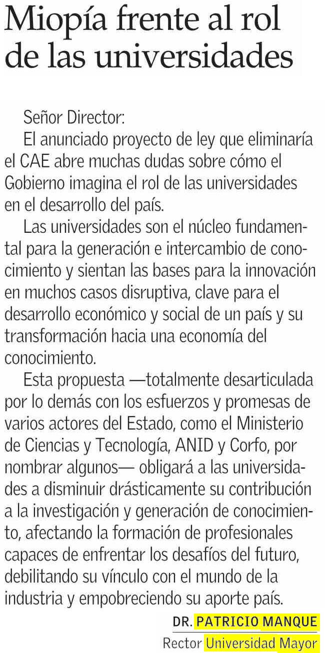 El Dr. Patricio Manque, rector de la U. Mayor, escribe carta al Director en El Mercurio, el 16 de octubre de 2024.